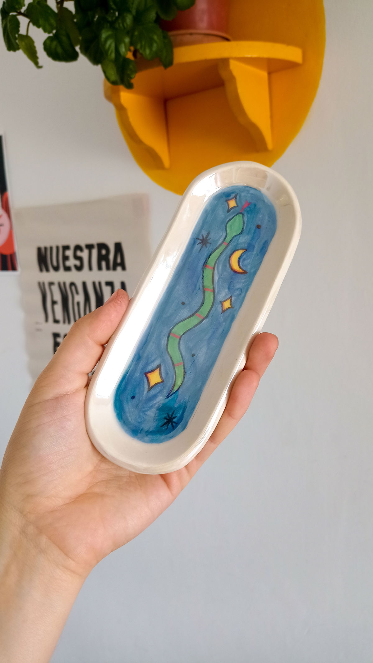 Plato largo pintado a mano, con baño de nácar perlado, lo que le da un efecto tornasolado.