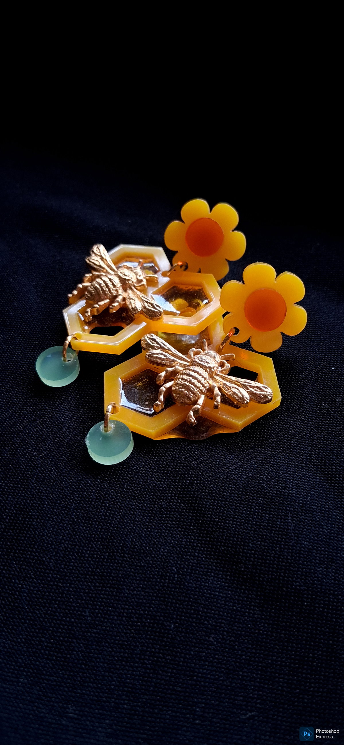 Hechos en acrílico, con apliques metálicos y resina que simula la miel.