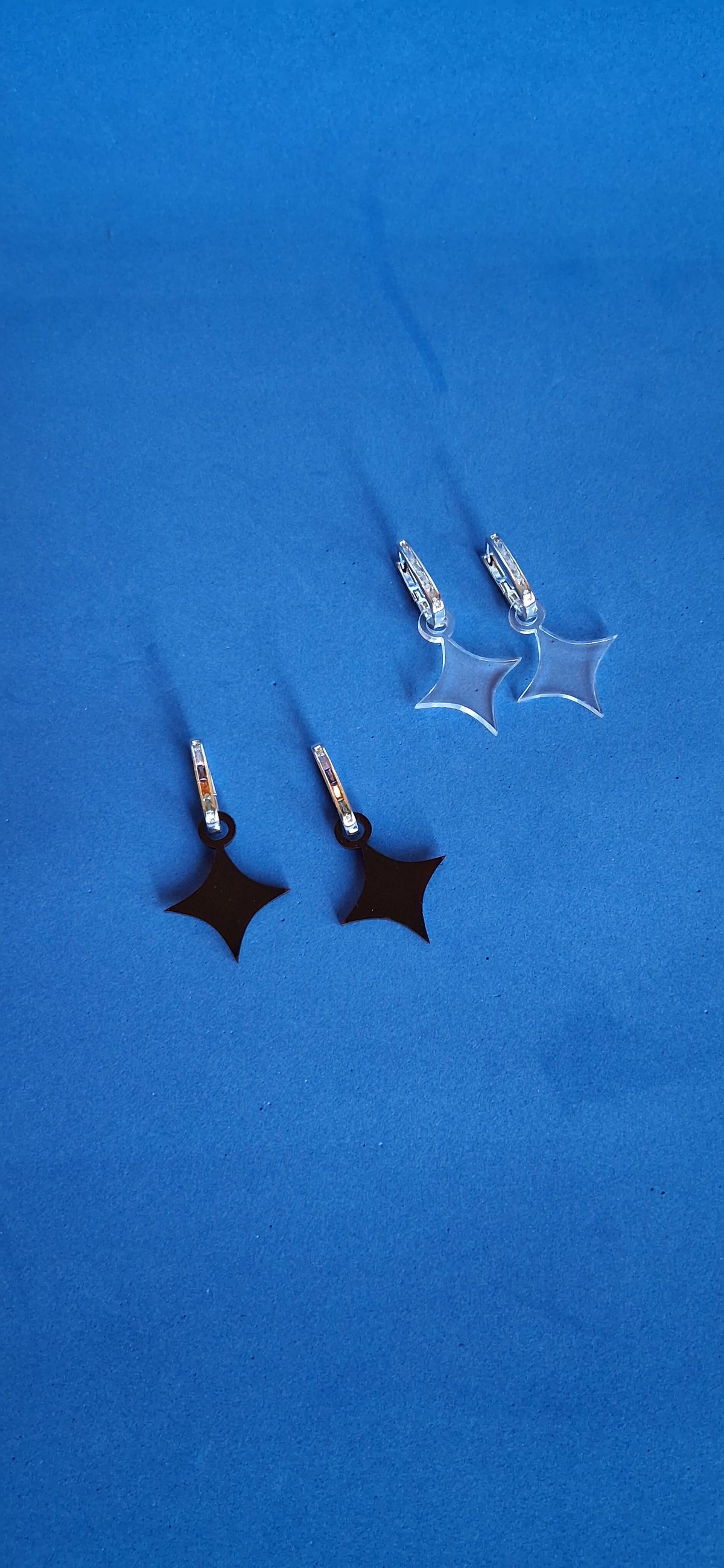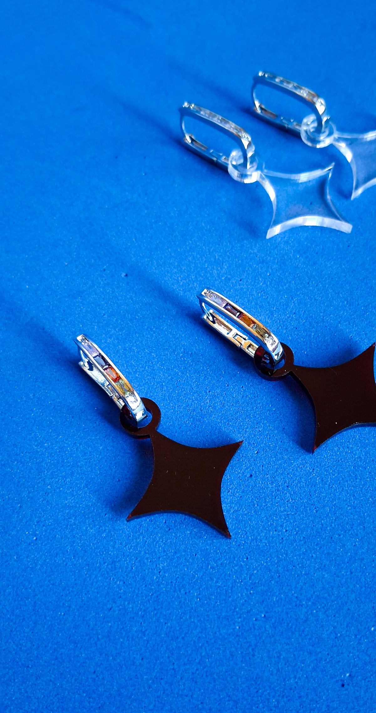 Aros de acrílico, con pasante de acero quirúrgico de edición especial, con strass blancos y multicolores.