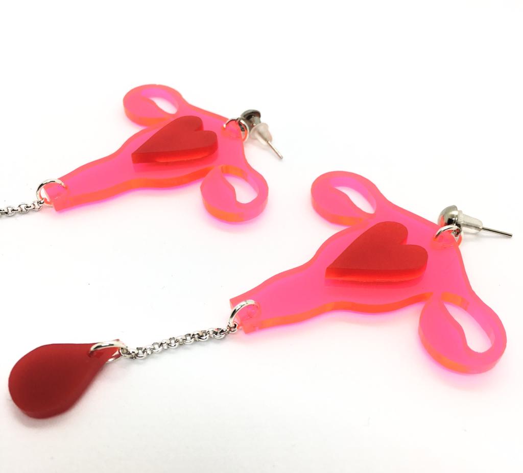 Aros de acrilico rosa neon, con corazon y gotita en acrilico rojo